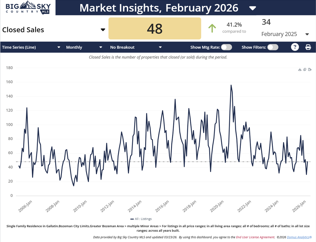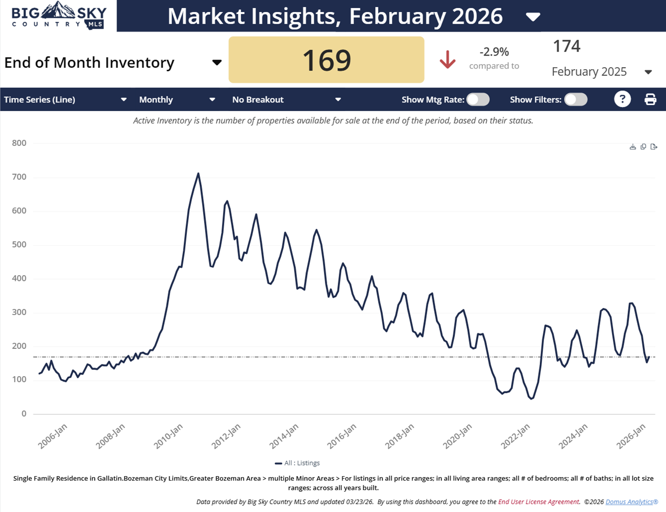 Homes For Sale/Sold Homes = 169/48 = 3.52, which means it will take ~3.52 months to sell a home in Bozeman in March of 2026.