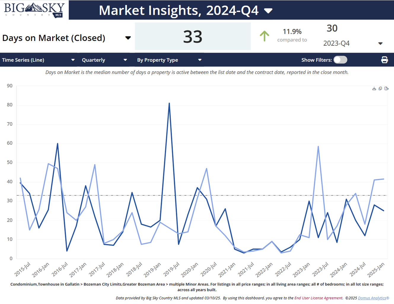 Chart 2: Median days on market (DOM) in all of Bozeman is 33.