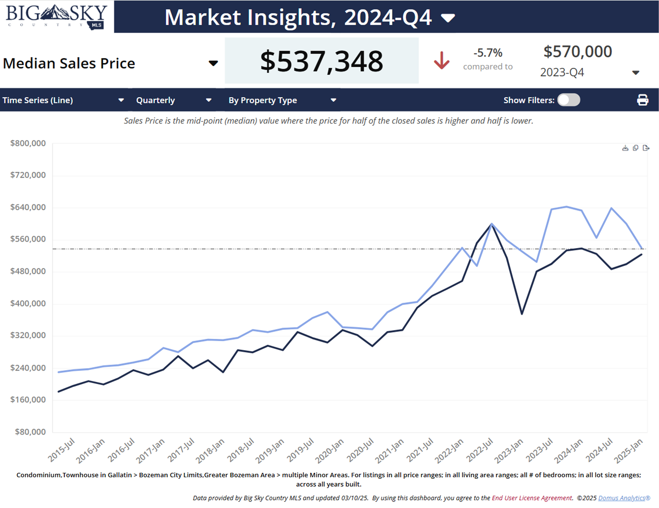 Chart 1: Presently, near the end of Q1 2025, condo and townhome median price in Bozeman is $537,348.