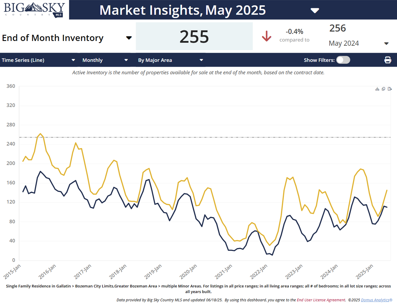 Inventory in August 2025 is 321 homes for sale in Bozeman.