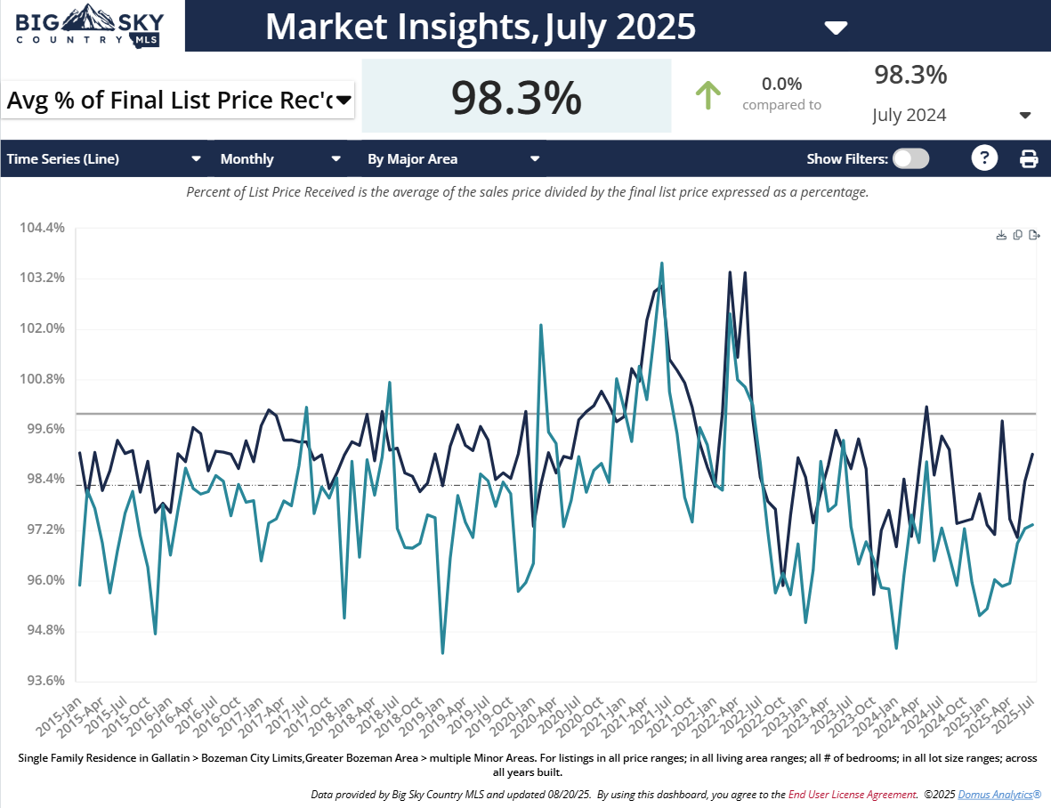 Photo August 2025, Average percent of list price inside and outside Bozeman.