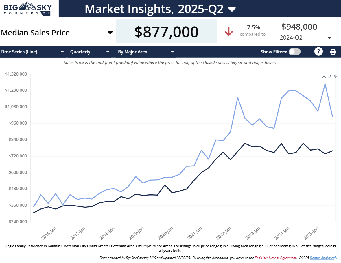 Chart 1: All Bozeman: Q2 2025 median home price is $877,000, ⇓ $71,000 or ⇓ 7.4% from the Q2 2024 median price of $948,000.