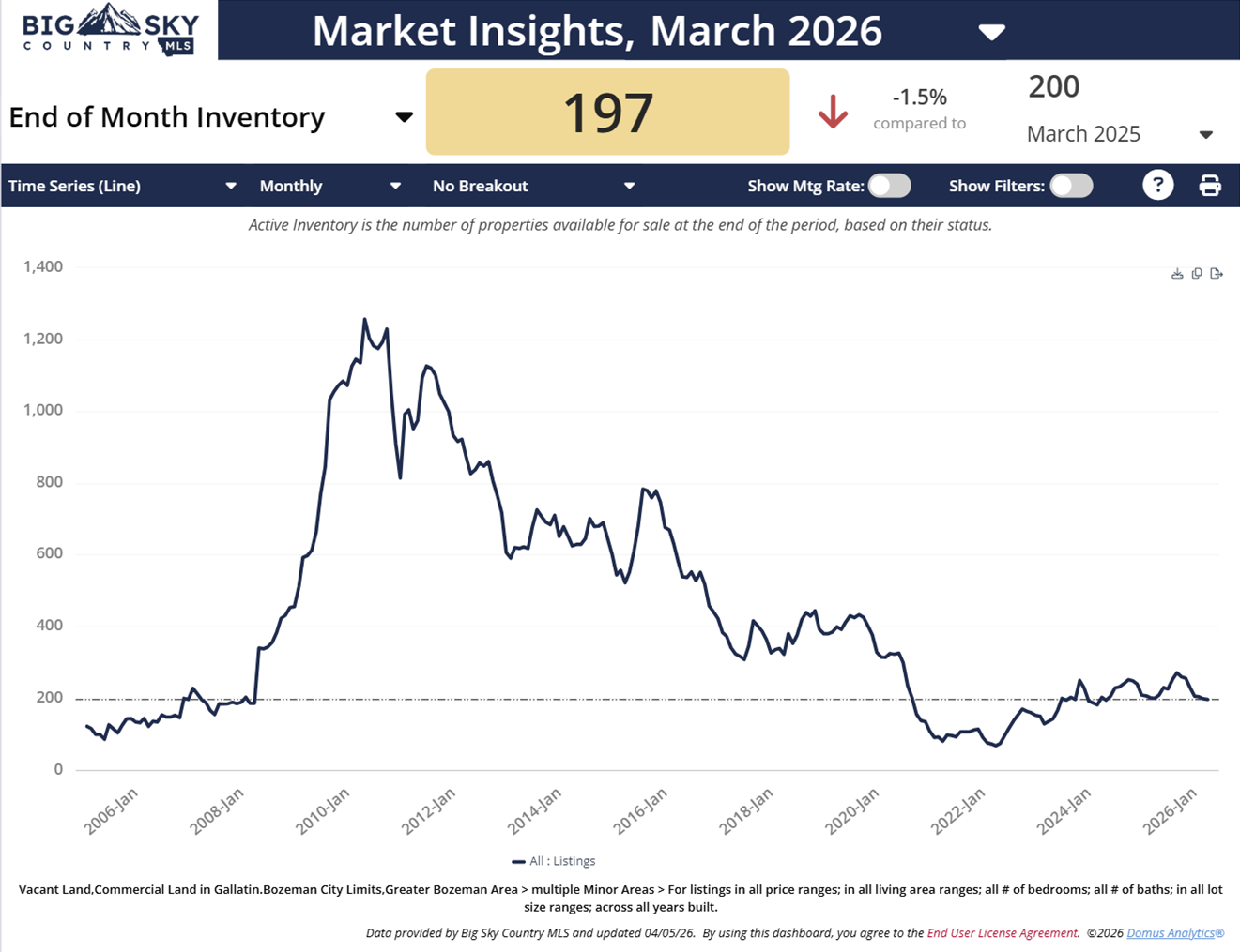 Presently, the inventory is 197 land listings. The number of listings continues down in 2026.