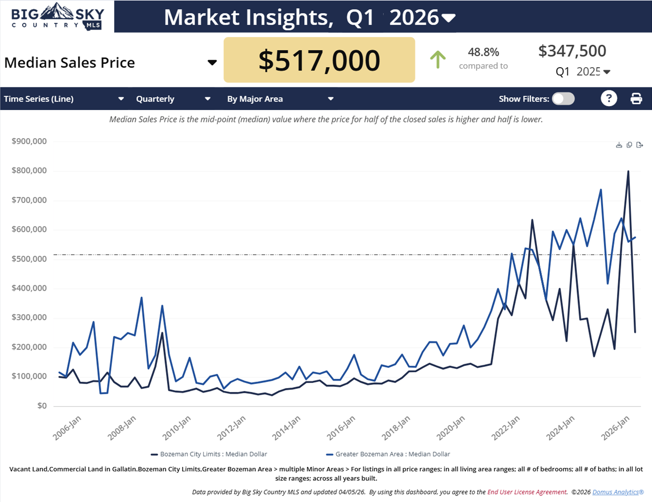 A year ago in Q1 2025, the overall median price for land in Gallatin County was $347,000. In Q1 2026, the price is $170,000 higher, at $517,000.