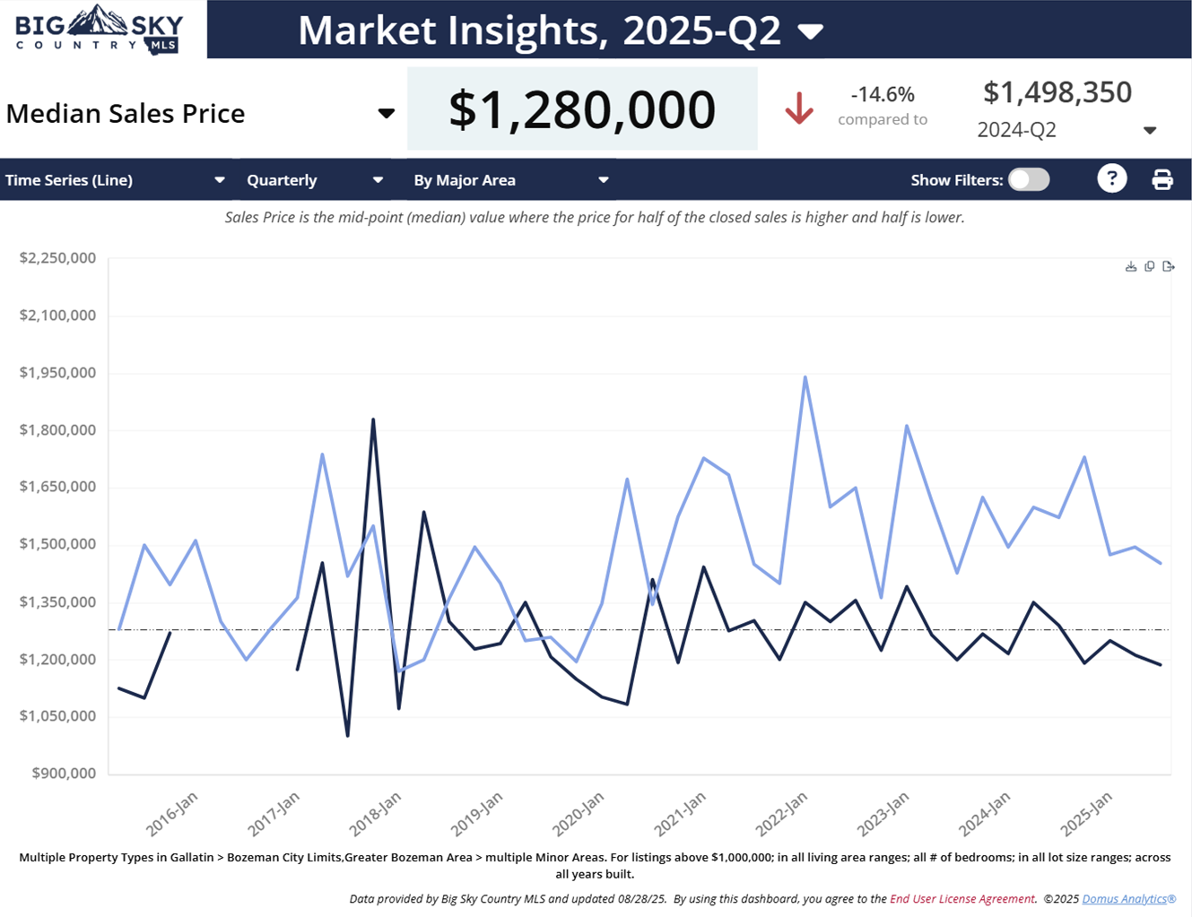 Outside Bozeman’s city limits, the Q2 2025 median price came in at $1,452,500.