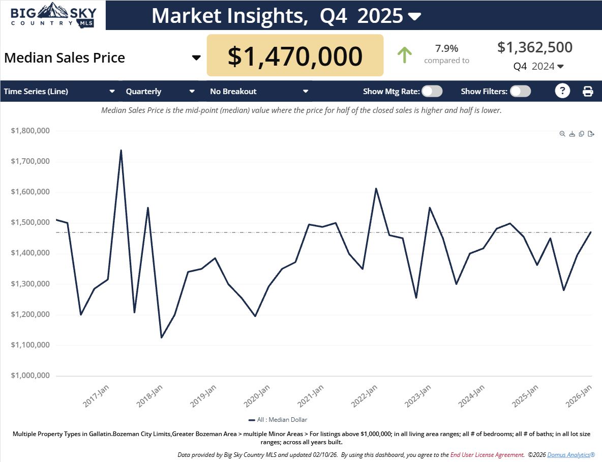 Photo Q4 2025 median sales price, Bozeman luxury homes, condos & townhomes over $1M.