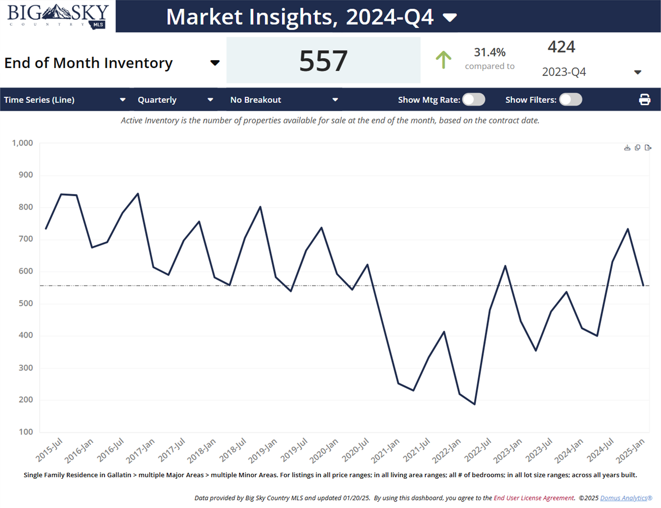 At the end of Q4 2024, there were 557 homes for sale in Gallatin County.