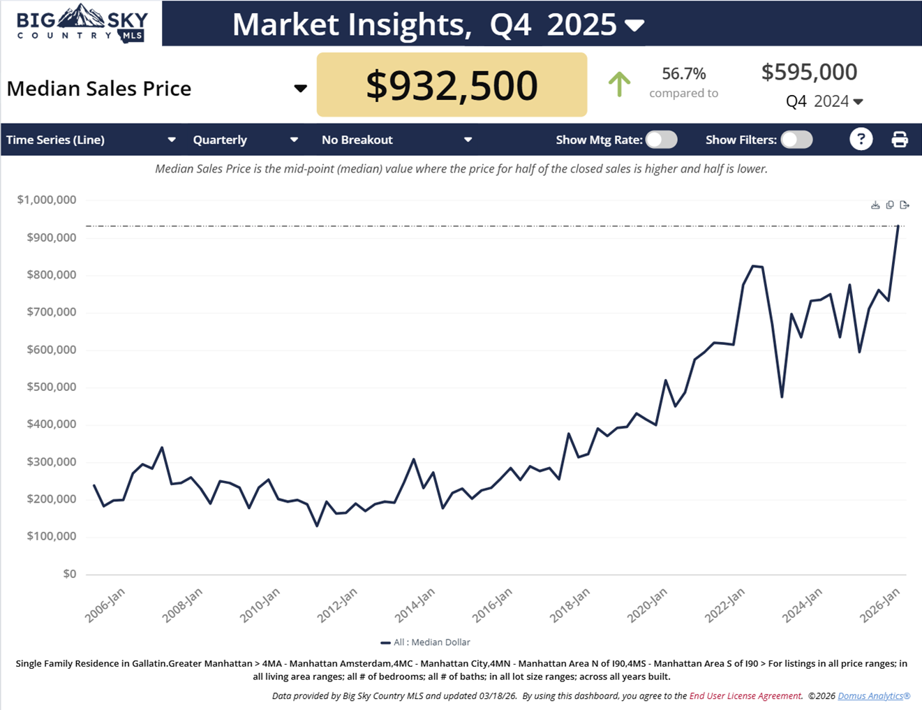 Price for a Manhattan, MT home is $932,500, ⇑ 36.2% over Q4 2024’s $595,000.