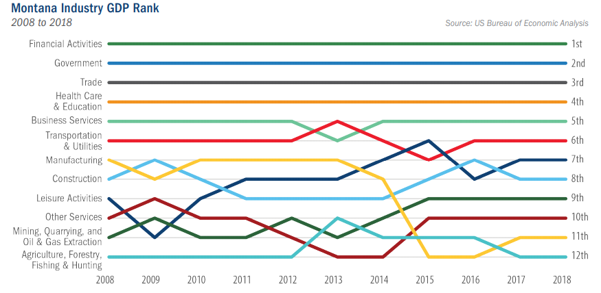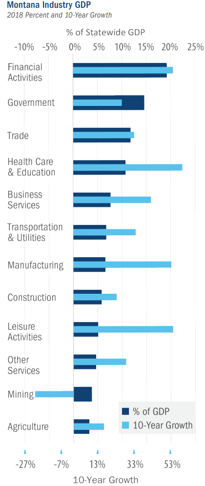 From 2008 to 2018 of the twelve main industries fueling Montana’s economy, two, Healthcare and Leisure Activities grew fastest, but just two components, Financial Activities and Government, made up 33% of the total GDP.