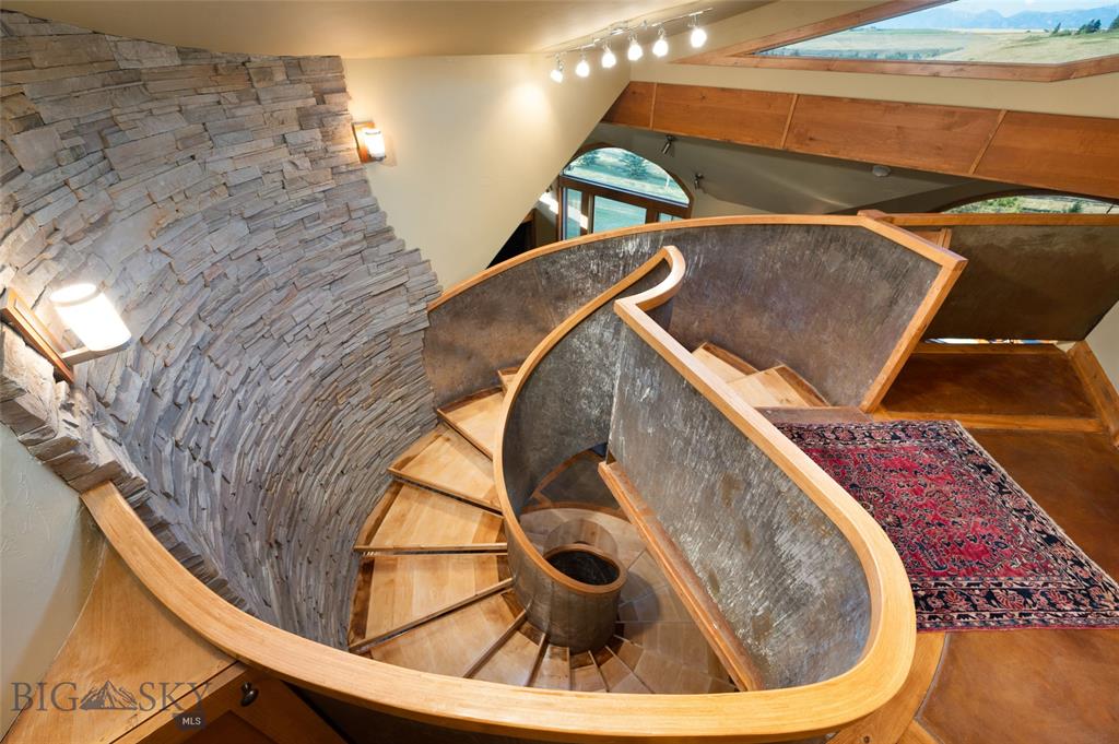 Never tire of the astonishing circular staircase with handcrafted wooden steps, steel and wood wall railing, and a palisade of stone within, reaching to the ceiling.